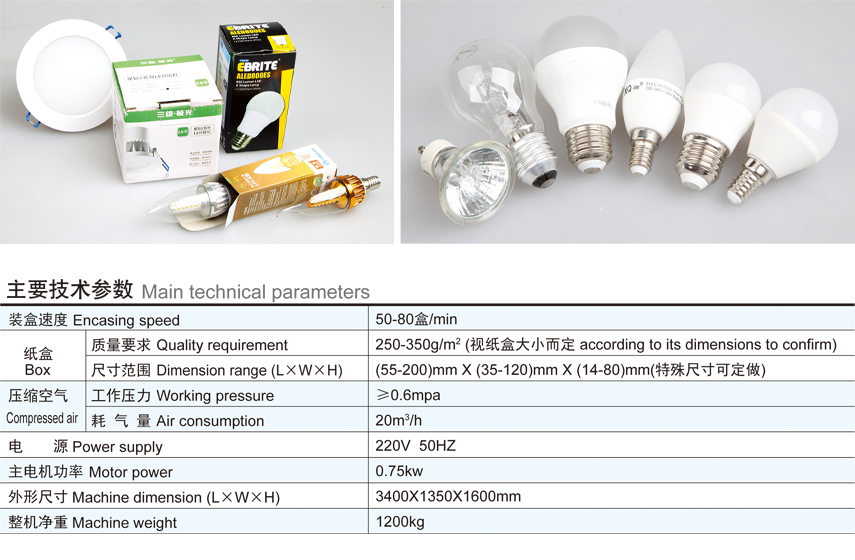 本產品是我公司結合國外包裝機的先進技術及根據目前照明、電子等行業的實際情況而研發的具有新型、先進的包裝機械設備,是機、電、氣光一體化的高科技產品。本產品適用于照明、電子等行業各類球泡燈、蠟燭(尾)燈、筒燈、射燈、單端熒光燈、節能燈、鎮流器等等以及相類似物品的裝盒包裝。具有將紙盒自動打開、物品裝盒、封盒等功能;同時也是解決目前招工難、管理難而代替勞動力的先進自動包裝設備。該機可以單獨使用亦可以與其他設備聯動使用,形成成套生產聯動線。