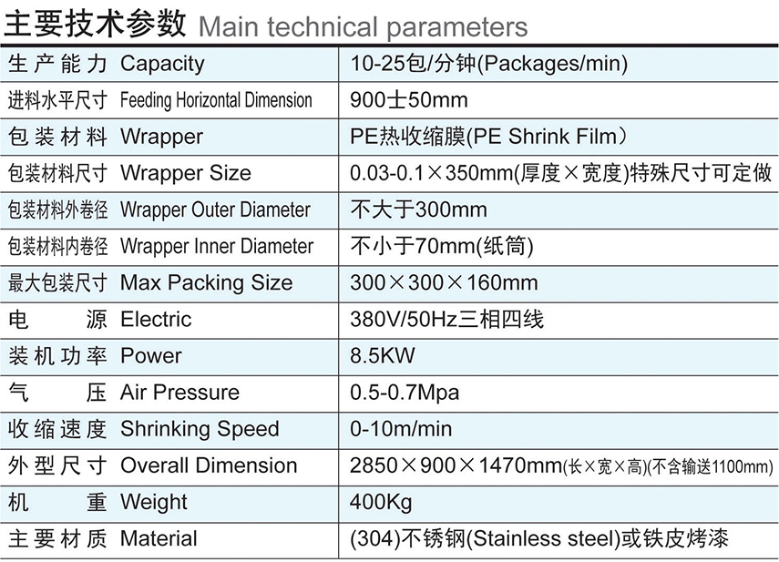 本產(chǎn)品適用于裝盒機(jī)紙盒出來后集盒包裝,是用PE膜進(jìn)行袖口式熱收縮包裝。包裝方式有:單排包裝、前后排包裝、上下排包裝。進(jìn)料包裝時(shí)可自動完成物品堆疊方式、輸送到位、自動將包裝膜輸送、進(jìn)行自動切封膜、然后收縮等功能;本設(shè)備是人機(jī)界面PLC控制,光電跟蹤、變頻調(diào)速;運(yùn)行中出現(xiàn)異常能自動顯示故障原因,及時(shí)排除故障。該機(jī)可單獨(dú)使用,亦可與裝盒機(jī)連接成自動生產(chǎn)聯(lián)動線。