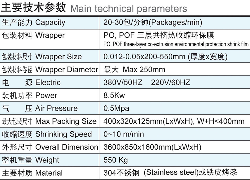 本產品適用于裝盒機紙盒出來后集盒包裝,是用PO, POF膜進行全封閉式熱收縮包裝,包裝方式有:單排包裝,前后排包裝、.上下排包裝; 進料包裝時可自動完成物品堆疊方式,輸送到位,自動將包裝膜輸送,進行自動切封膜、然后收縮等功能;本設備是光電步進控制袋長度、無級調速收縮速度、人機界面PLC控制,光電跟蹤、變頻調速;運行中出現異常能自動顯示故障原因,及時排除故障.該機可單獨使用,亦可與裝盒機連接成自動生產聯動線。